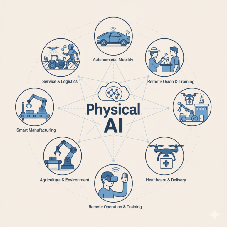 기존의 AI가 소프트웨어 환경(예: 웹 검색, 이미지 인식, 자연어 처리)에서 주로 작동했다면, 피지컬 AI는 로봇, 자율 주행차, 드론 등과 같은 물리적 실체를 통해 현실 세계와 상호작용 합니다.